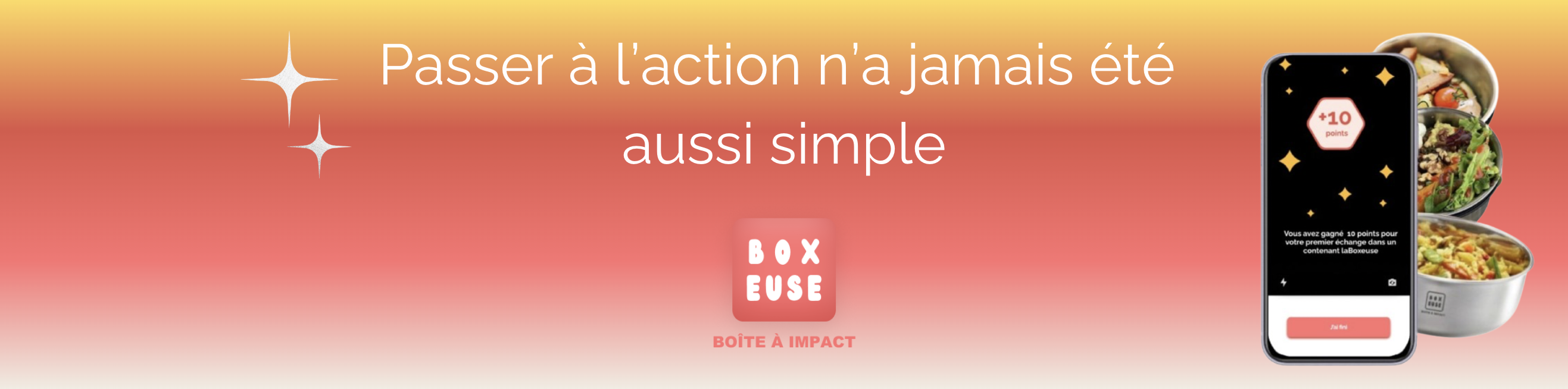 Notre mission : remplacer les emballages à usage unique (carton, plastique…) par un système d’échange de boîtes en inox, via une appli mobile simple et incitative.